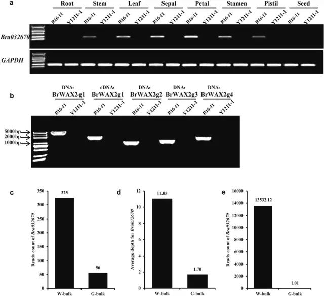通过半定量RT-PCR和qRT-PCR来检测Bra032670在两个亲本不同组织中的表达情况。Bra032670在Y1211-1中的八种组织中均未转录(图4a)。相比之下,在R16-11中的茎、叶、萼片、花瓣、雄蕊和雌蕊表达要高得多。RNA-Seq分析显示Bra032670是差异最显著的基因,其在光滑茎中的表达水平约为蜡茎的13000倍(图4e)。结果表明Bra032670基因是BrWAX2最可能的候选基因。 为了鉴定候选基因在亲本系中的序列,使用引物BrWAX2-g1对Bra032670的基因组序列和编码序列进行扩增和测序。使用gDNA或cDNA作为模板从Y1211-1中没有获得扩增产物(图4b),推测在Y1211-1中缺少Bra032670基因。W-bulk中比对到Bra032670基因的BSA-Seq读数的数量为325,而G-bulk中只有56个(图4c)。Bra032670的平均BSA-Seq深度在W-bulk中为11.05,而在G-bulk中仅为1.70(图4d)。3个G-bulk重复中,Bra032670的RNA-Seq读数仅为1.01,相比之下,Bra032670在三个W-bulk的平均表达读计数高达13,532.12(图4e)。这些高通量测序数据进一步表明,Bra032670基因在Y1211-1中缺失。