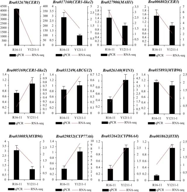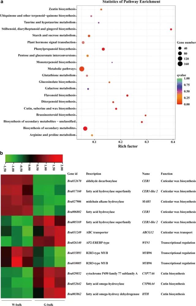 图4 BrWAX2候选基因分析 (5)蜡质和光泽茎的转录组分析 在W-bulk和G-bulk之间共检测到1399个DEGs。KEGG富集分析表明,角质、木栓质和蜡的生物合成、次生代谢物的生物合成和代谢途径是显著富集的途径(图5a),并且这些途径中的大多数基因在G-bulk中的表达水平较低,与光泽植物中蜡含量的降低一致。 与W-bulk相比,G-bulk中参与蜡生物合成的烷烃形成途径的基因如CER1(Bra032670)、CER3(Bra006802)和MAH1(Bra027906)显著下调,表明烷烃形成途径在G-bulk中受到抑制。参与角质层蜡转运的基因ABCG12(Bra031249)在G-bulk中上调。参与调节角质和蜡生物合成的基因WIN1(Bra026140)上调,而MYB96(Bra035893)和MYB96(Bra010085)在G-bulk中下调。此外,参与角质生物合成的基因,例如CYP77A6(Bra029852)、CYP86A4(Bra032642)和HTH(Bra003862),在G-bulk中显著上调(图5b)。进一步对蜡代谢相关基因进行qRT-PCR分析,与RNA-Seq结果一致(图6)。 图5 蜡质和光滑茎的转录组分析 图6 用qRT-PCR验证RNA-Seq数据的表达 研究结论本研究确定了大白菜表皮蜡生物合成的BrWAX2基因。采用BSA-Seq和通过KASP分析的连锁分析将BrWAX2基因定位到100.78 kb的区间。RNA-seq功能注释分析、表达分析和序列变异分析表明,编码醛脱羧酶的Bra032670是BrWAX2最可能的候选基因。BrWAX2的缺失,以及烷烃形成途径中其他基因表达的降低,减少了蜡的数量,并导致了光泽表型。