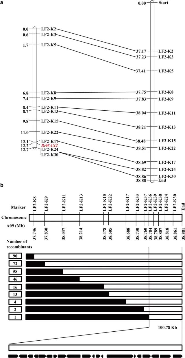 (3)BrWAX2基因的精细定位 为了初步定位BrWAX2基因,对W-pool和G-pool进行BSA-Seq分析。在染色体A09上以95%的置信水平识别出一个从37.35到38.88 Mb的1.53 Mb候选区域。W-pool的平均SNP指数为0.60,而相应区域G-pool的平均SNP指数为0.11。结果表明,该基因组区间存在一个主基因,这与Y1211-1的光泽性状由一个隐性核基因控制的假设一致。 基于BSA-Seq分析,在候选区域建立了30个KASP标记,用于筛选两个亲本,12个KASP标记表现出良好的多态性。BrWAX2位点与LF2-K24和LF2-K17的遗传距离分别为0.5和0.1 cM,遗传图谱中标记的顺序与物理图谱中的顺序一致(图3a)。 使用flanking标记(LF2-K8和LF2-K30)筛选了967个有光泽的F2植物,并鉴定了90个重组体(图3b)。标记LF2-K30与BrWAX2基因共分离,所有90个重组体均被标记LF2-K8筛选出来,BrWAX2基因限定在标记LF2-K36和染色体A09末端之间的100.78 kb间隔。 图3 大白菜BrWAX2基因的初步和精细定位