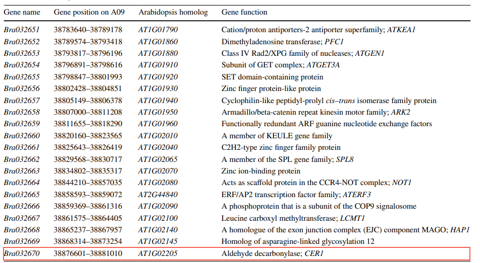 (4)候选基因分析 基于BrWAX2的精细定位结果,在Brassica数据库中分析了100.78kb间隔内的DNA序列,并对拟南芥进行了比较基因注释。结果显示,在作图区域识别出20个注释或预测基因(表2)。对来自BRAD的这20个基因的注释分析表明,只有一个名为Bra032670的基因可能是候选基因,该基因与拟南芥中的CER1同源。CER1编码一种醛脱羧酶,在角质层蜡生物合成过程中催化C30醛转化为C29烷烃。