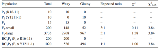研究结果(1) Y1211-1的光泽性状是由单基因隐性基因控制 R16-11所有气生器官表面,如花序茎(图1a)、花序叶(图1b)、种子、花芽等均被蜡覆盖。相比之下,Y1211-1对应器官的外观(图1d、e)则趋向于光滑的绿色。用低温扫描电镜(Cryo-SEM)检测了花序叶片蜡晶密度,发现R16-11的叶片表面覆盖着大量蜡晶,主要为棒状和板状(图1c)。而Y1211-1的叶片仅被少量蜡晶覆盖(图1f),说明Y1211-1的光滑表型是由蜡晶减少引起的。