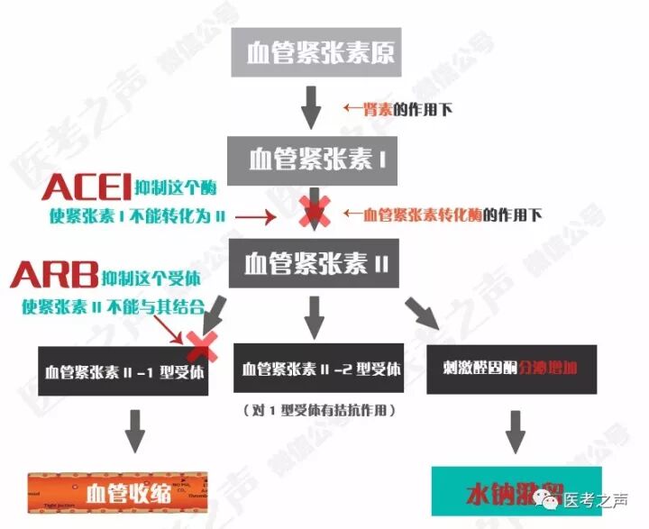 导致血管紧张素Ⅱ产生就减少了, ARB阻断血管紧张素受体1, 导致血管紧张素Ⅱ就发挥不了功能了 这不就降血压了