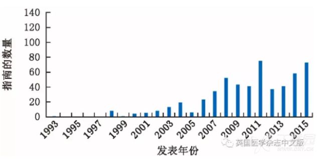 昨天逛着微信喝着茶,看到BMJ怼起了中国指南 。。。 BMJ 还表示,这次约稿反映了世界眼中的中国热点。 首先,BMJ 总结了中国指南特色: 1. 中国作为全世界人口最多的国家,通过指南来实施具有成本效果的医疗干预措施和医疗保健策略,将有助于优化医疗资源的使用和提升患者的健康结局;(人多) 2. 中国不同地区和医院之间的临床实践差异非常大,指南通过提供规范化的诊疗措施,有助于减少这种诊疗上不必要的差异性;(地区差异大) 3. 中国是全球唯一一个在初级、二级和三级诊疗体系上中西医并行的国家。中医药占中国医疗服务的比例约为40%。指南有助于医务人员甄别和使用中医和西医当中循证的推荐意见,从而让患者接受到更加安全有效的干预措施。(中西医结合特色) 其次,BMJ 分析了中国指南现状: 1993~2010年,中国共有256个不同的指南制订小组在115种医学期刊上发布了269部指南。此后指南的数量仍然在快速增长(图1)。 图1.中国1993—2016年在中文期刊发表的指南数量(n=664)。