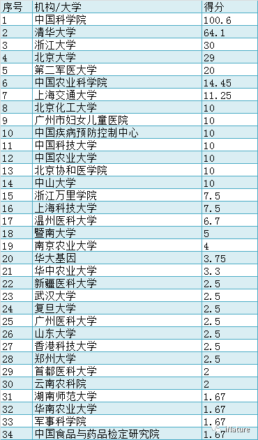 1.总体情况 经过系统分析,我们发现,对于这51篇文章总共有34个中国的通讯单位,其中中国科学院得分最高,到达了100.6,之后就是清华大学,北京大学,浙江大学,第二军医大学,具体排名如下(图1所示):