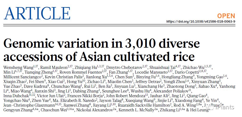 2018年4月26 日,国际顶级期刊《自然》杂志长文发表由中国农业科学院作物科学研究所牵头,联合国际水稻研究所、上海交通大学、华大基因、深圳农业基因组研究所、安徽农业大学、美国亚利桑那大学等16家单位共同完成的“3010份亚洲栽培稻基因组研究”。