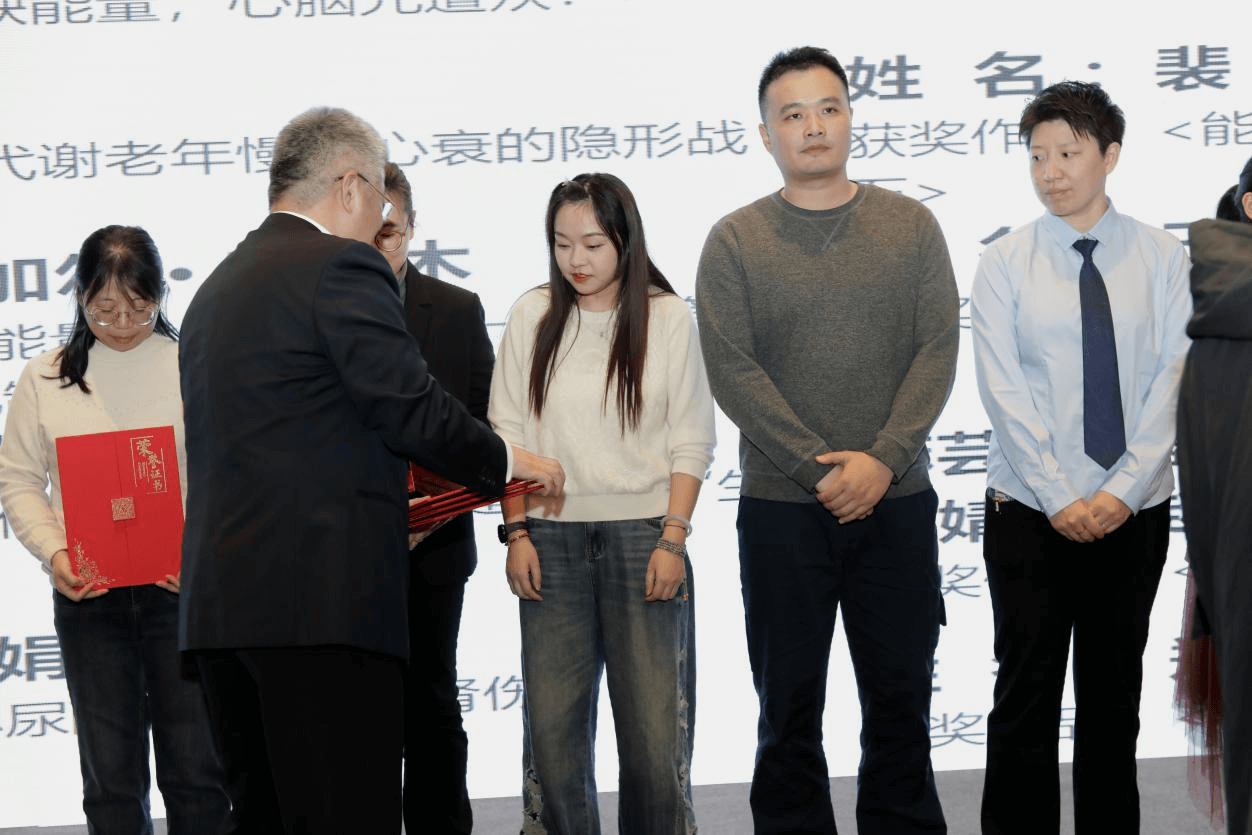 吉训明院士、管仲军教授为第一名获奖者颁奖 《守护大脑的电网:脑王国的术后能量大冒险》、《终于明白了,“自由基”是这么回事》、《能量代谢:解锁脑心健康的核心密码》等9项作品获得本次健康科普大赛第二名。
